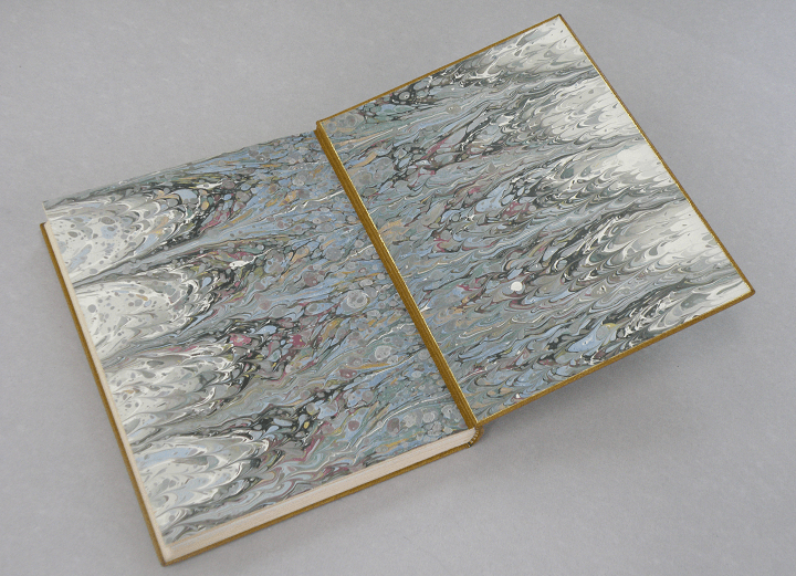 マーブル染めは、溶液に絵具を落とし液面に模様を描いて写し取る技術で、17世紀のヨーロッパで広まり、書籍の表紙や見返し紙などの装丁材料に用いられました。