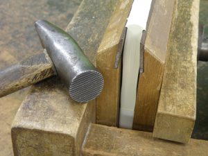 ヨーロッパのバッキングボードやハンマーに比べて日本のものは使いやすいと思います。日本で考案された耳出し用のハンマー「筋玄能」(すじげんのう)は、叩く部分に「筋」(切込み)が入っていて、耳出し作業が的確に、かつ手早くできます。また、「バッケ板」は金属部分(背を挟む部分)が斜めになっていて耳部分が強く締められ滑り落ちることが有りません。