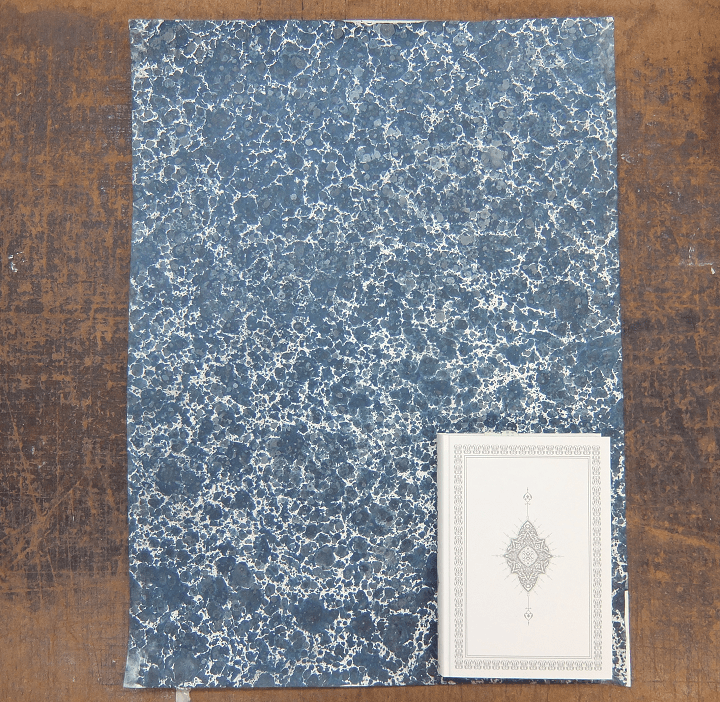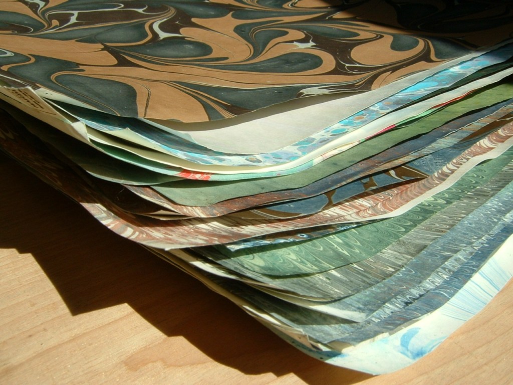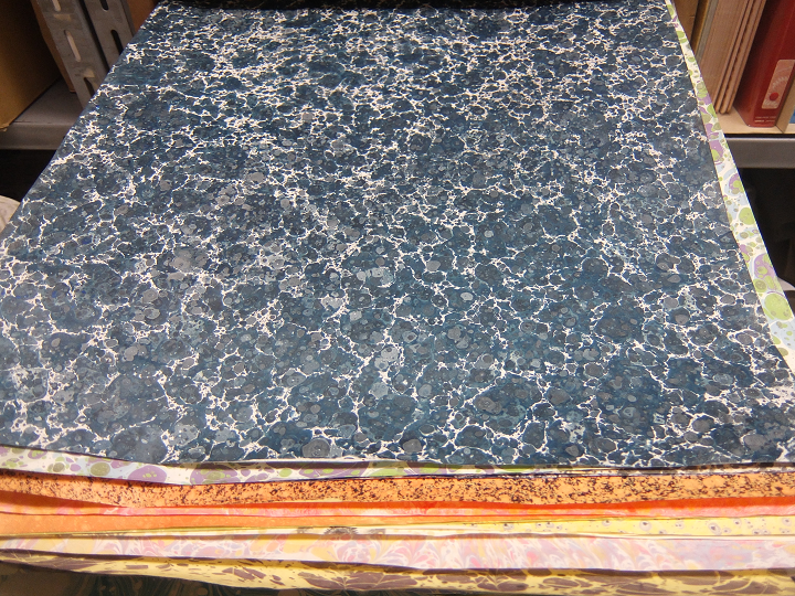 ヨーロッパでは古くから装飾に用いられている工芸紙で、その模様が大理石(marble)を連想させることからこう呼ばれるようになりました。 工芸製本では、本の表紙や見返し、函の装飾などに使います。